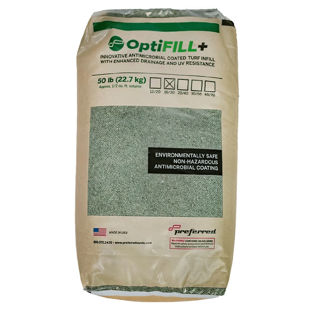 OptiFILL+ is a premium coated sand infill designed for durability, cleanliness, and environmental safety. Ideal for landscaping, it enhances turf stability and drainage while resisting compaction. For pet areas, it offers superior odor control and antimicrobial protection to keep surfaces fresh. On playgrounds, its round, cushioned particles reduce impact and static buildup for a safer, cleaner play environment. VOC-free and non-toxic, OptiFILL+ is built to perform in any climate – rain or shine, paws or play.